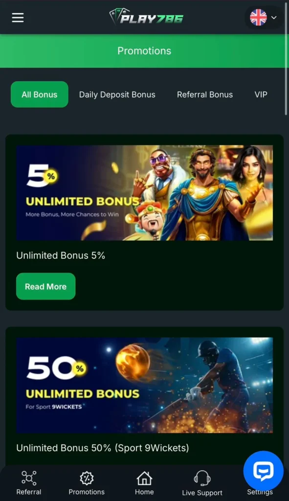 Play786 includes a referral system that rewards sharing. Players invite friends using a referral code. When friends join and play, both users receive bonuses.
